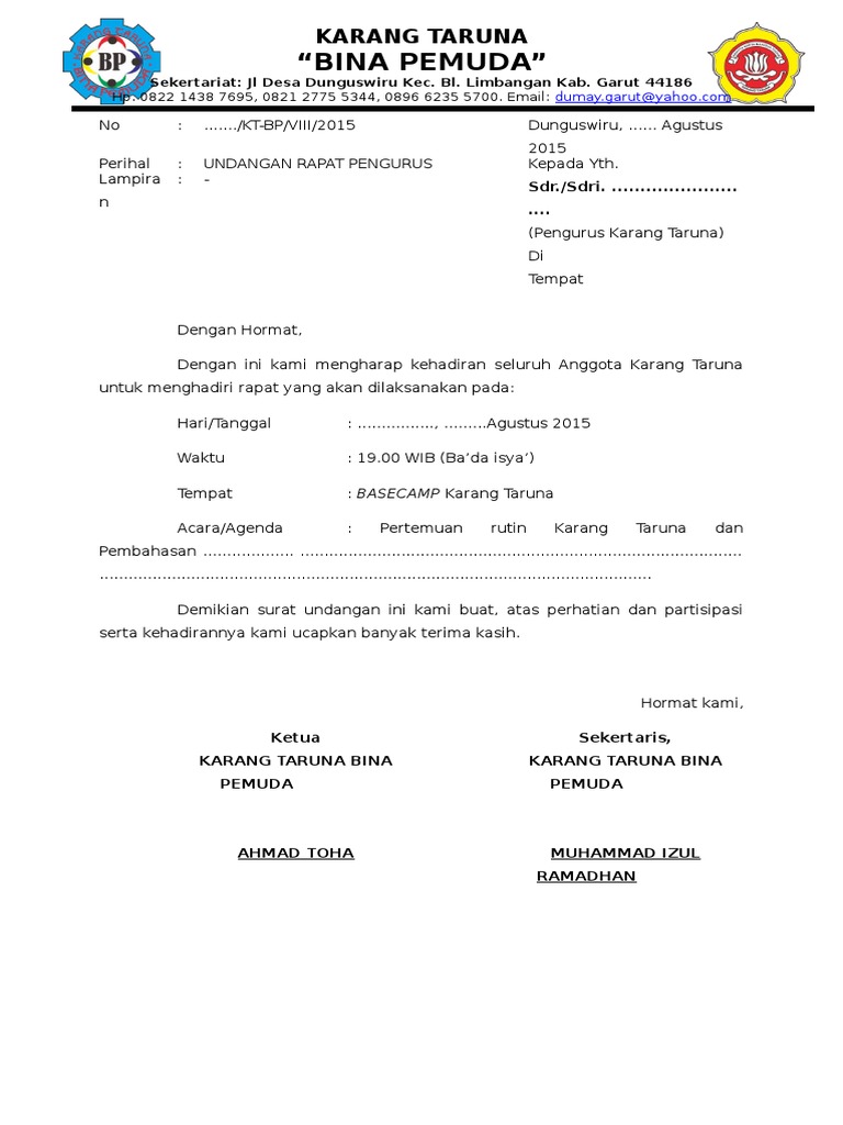 Berikut ini adalah contoh format surat undangan untuk warga di lingkungan karang taruna, bisa digunakan untuk persiapan acara 17 agustusan atau acara resmi lain, file format doc ms word bisa do bandung, 10 november 2020. Surat undangan rapat bpd adalah surat undangan khusus untuk kegiatan rapat/sidang/forum musyawarah desa yang diadakan oleh apakah anda sedang mencari contoh format surat undangan rapat bpd desa terbaru dalam rangka membahas dan menyetujui. Umumnya, karang taruna diikuti oleh anak muda yang ada di desa setempat dan mengadakan berbagai macam kegiatan yang berguna untuk nah, karang taruna ketika akan merencanakan acara dan persiapan, pastinya membutuhkan rapat terlebih dahulu. Contoh surat undangan merupakan gambaran surat yang bertujuan untuk mengundang adi danan jaya. Contoh surat undangan rapat karang taruna.